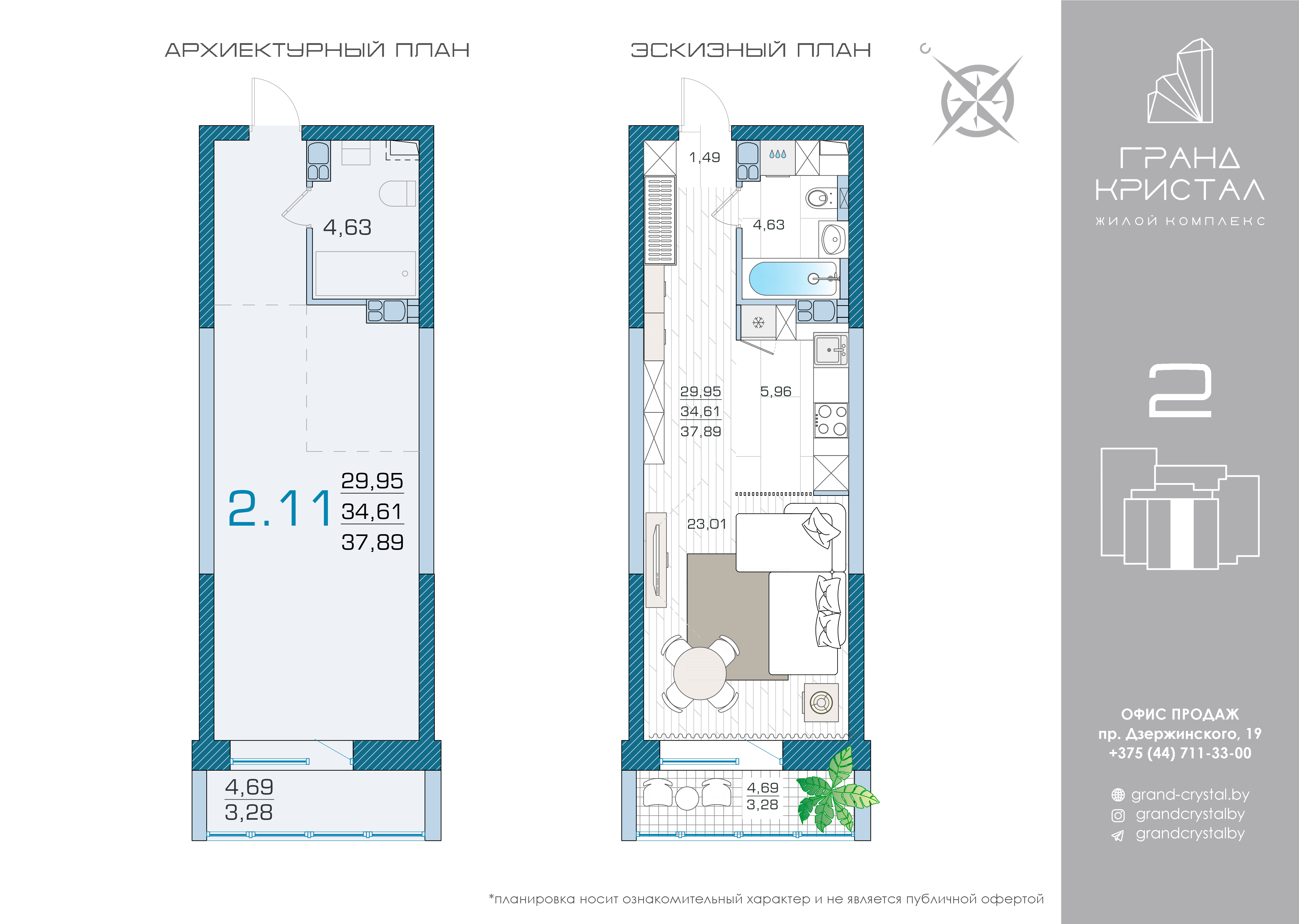 Квартира-студия с лоджией на юго-запад 2.11 площадь 37,89 м2